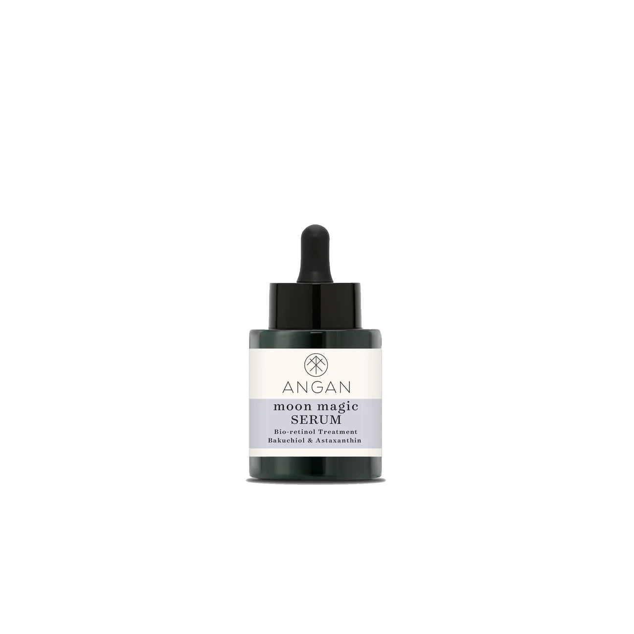 • ANGAN Moon Magic Bio-Retinol Serum in a glass bottle, featuring Bakuchiol, Astaxanthin, and Icelandic botanicals to firm, hydrate, and improve skin texture overnight.