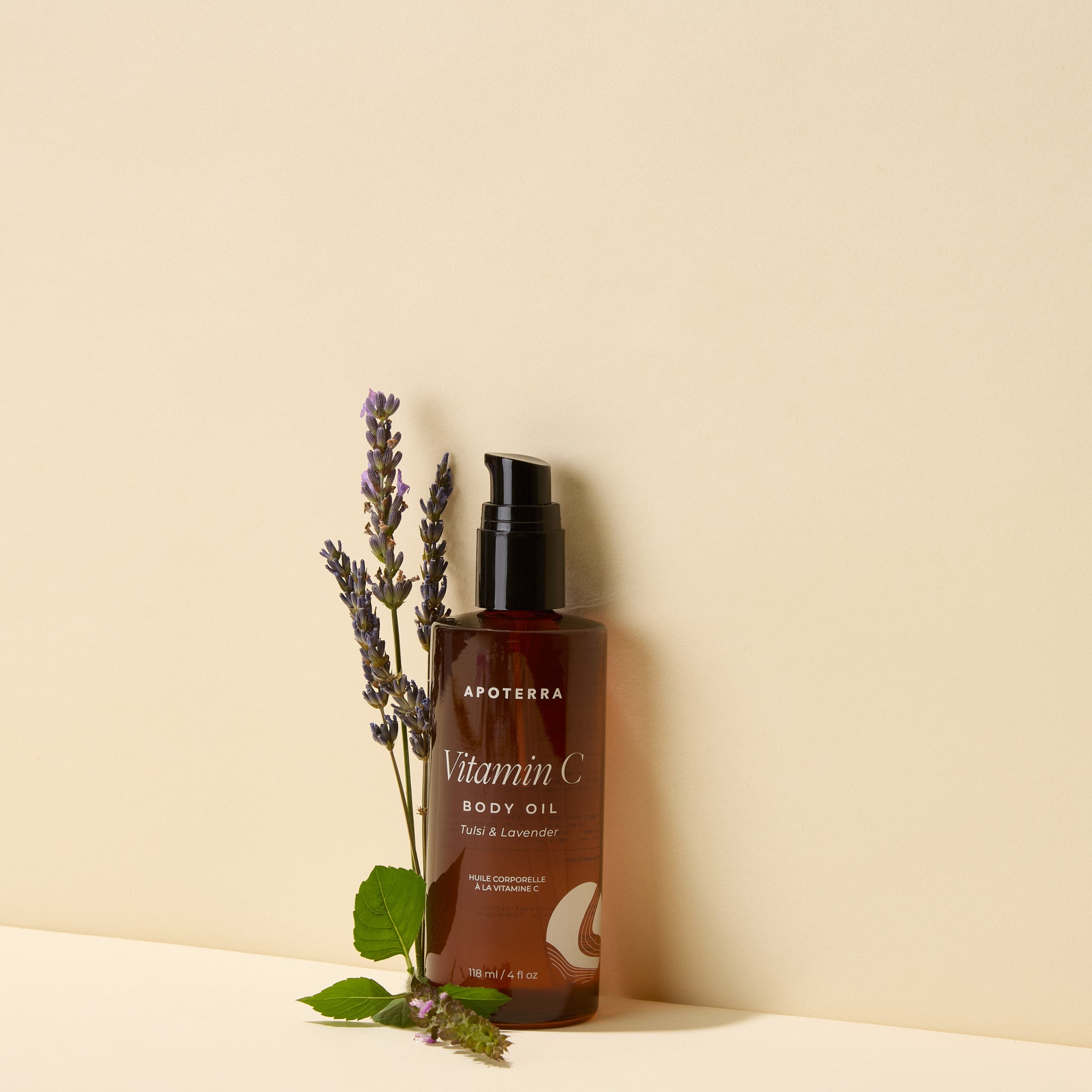 • Apoterra Vitamin C Body Oil Tulsi and Lavender bottle with natural ingredients including tulsi leaves, lavender flowers, and orange peel.