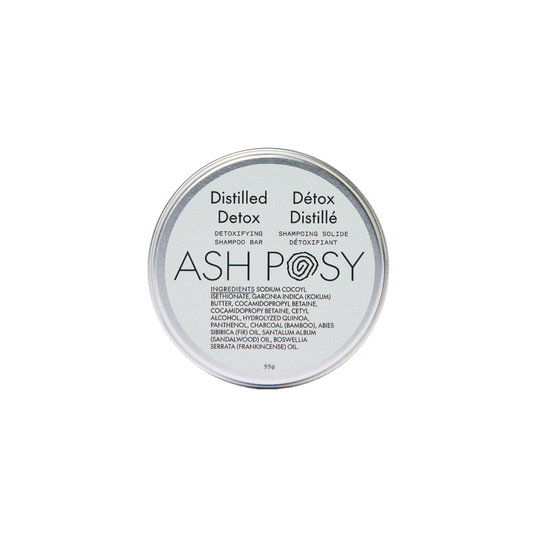 • ASH POSY Distilled Detox Shampoo Bar – a solid shampoo bar in a reusable tin, made with bamboo charcoal and organic botanicals for gentle, detoxifying hair care.