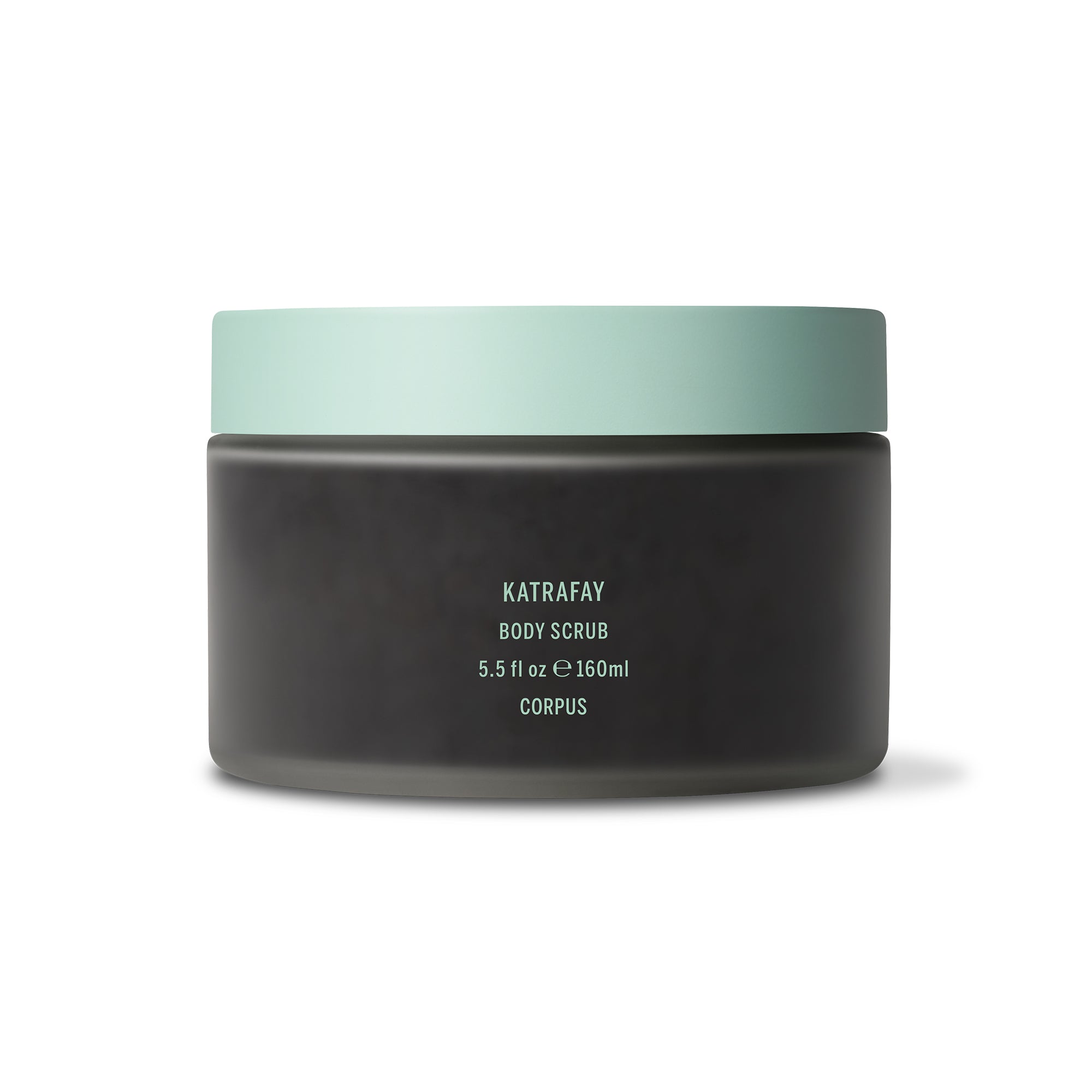 • CORPUS Katrafay Body Scrub in clear matte glass jar with mint lid on white background.