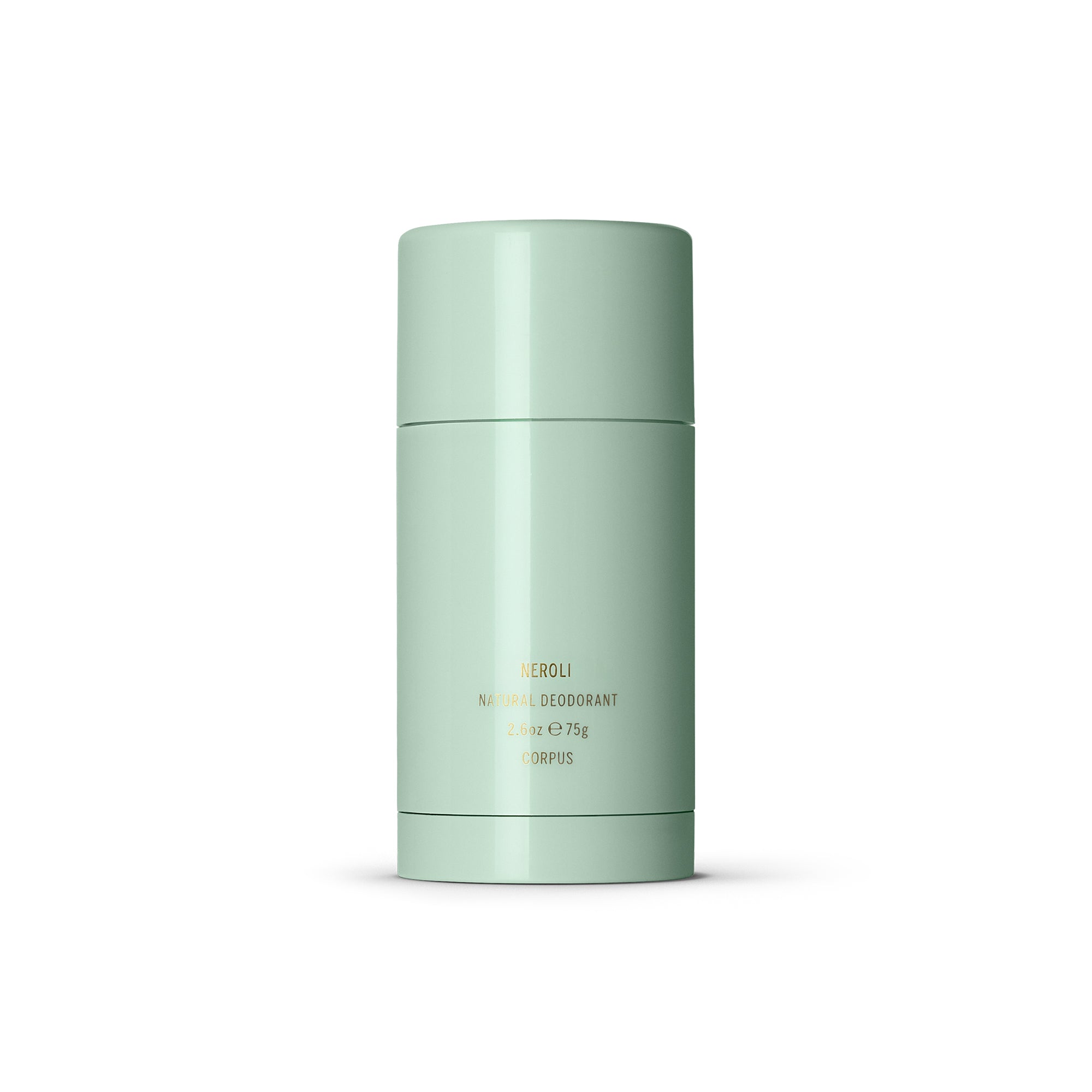 • CORPUS Neroli Natural Deodorant in aluminum packaging with neroli, orange blossom, and bergamot scent notes.