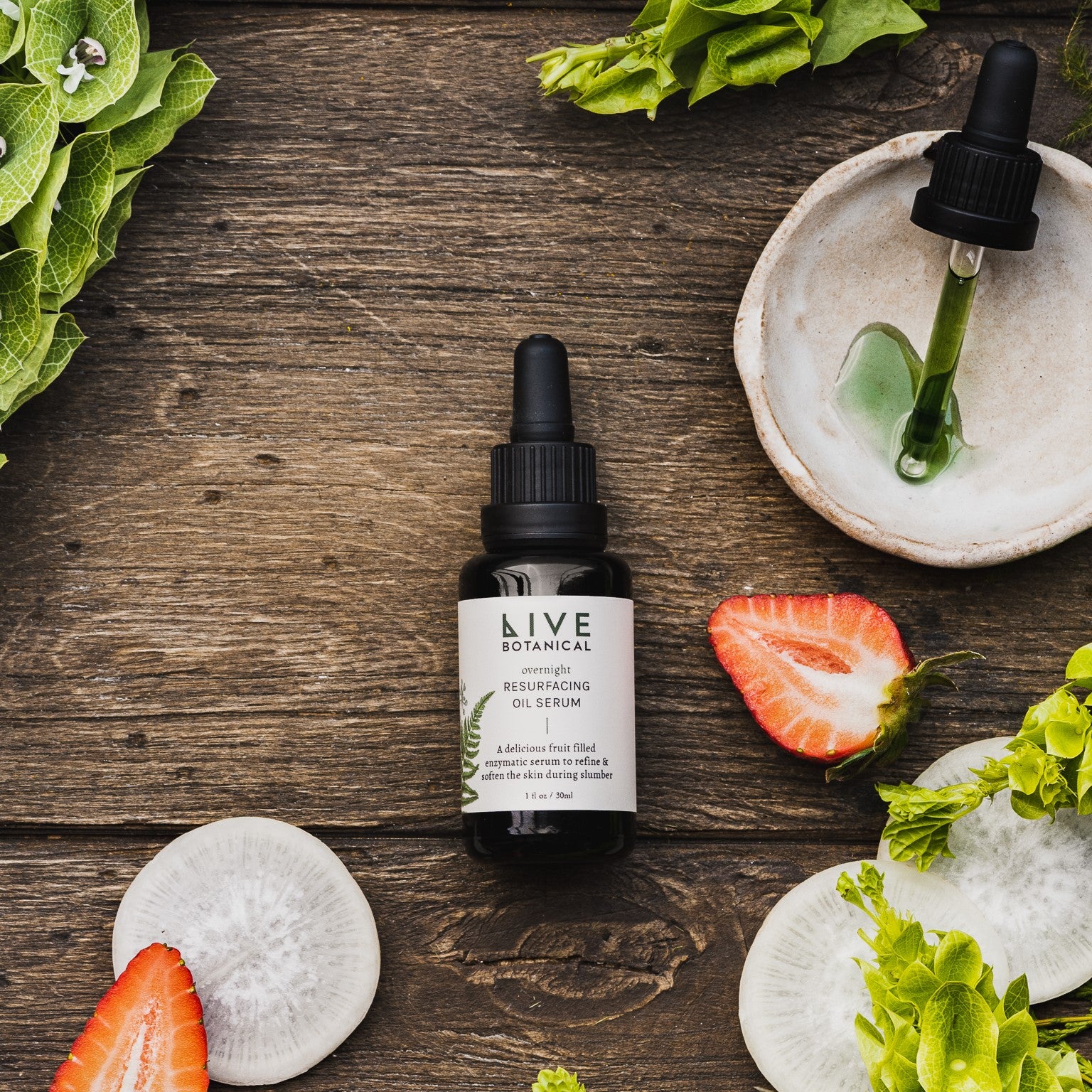 • Live Botanical Overnight Resurfacing Oil in a bottle, fruit-infused serum designed to nourish and renew skin overnight.