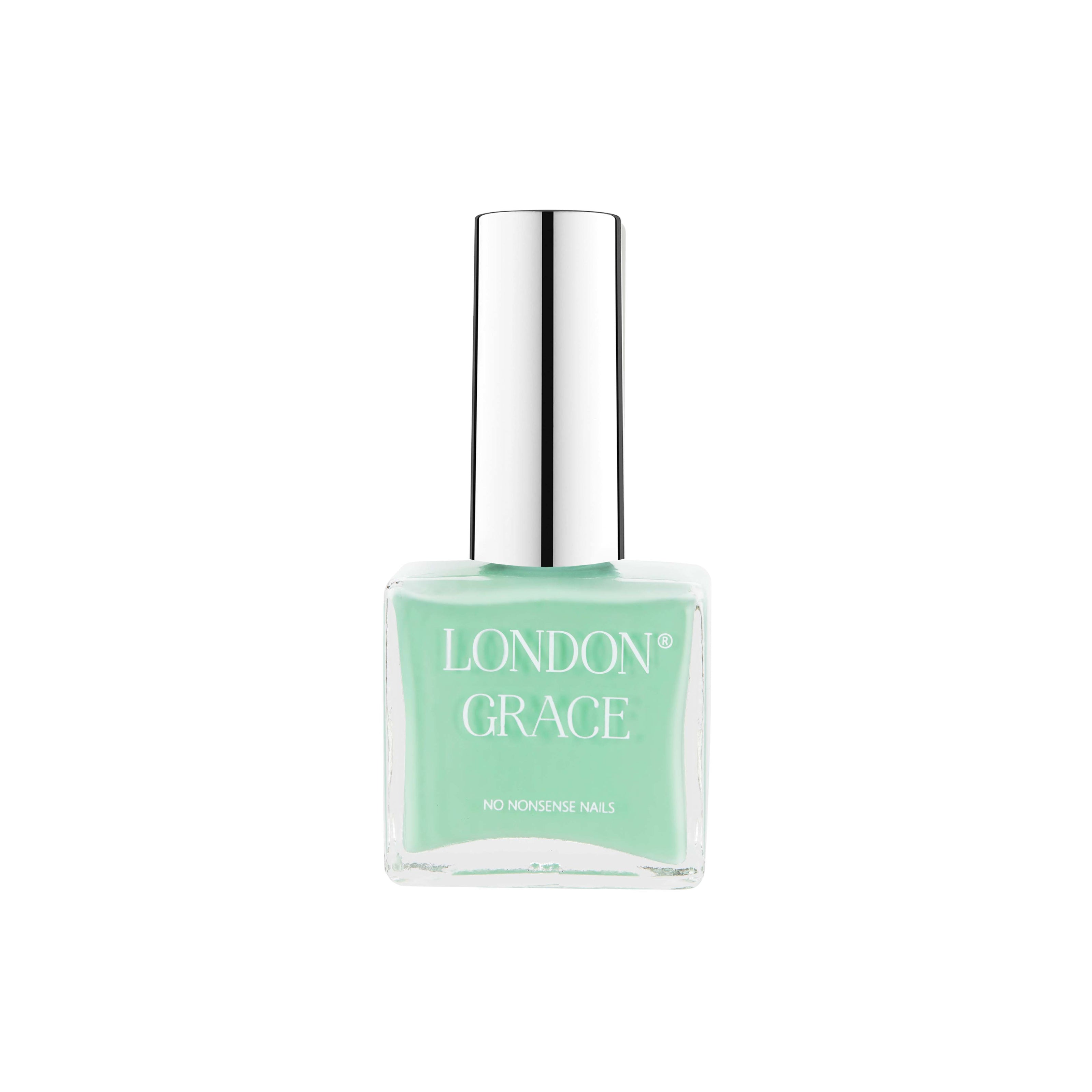 • London Grace Agnes Nail Polish in mint green pistachio hue, vegan, cruelty-free, and eco-friendly with a glossy, long-lasting finish.