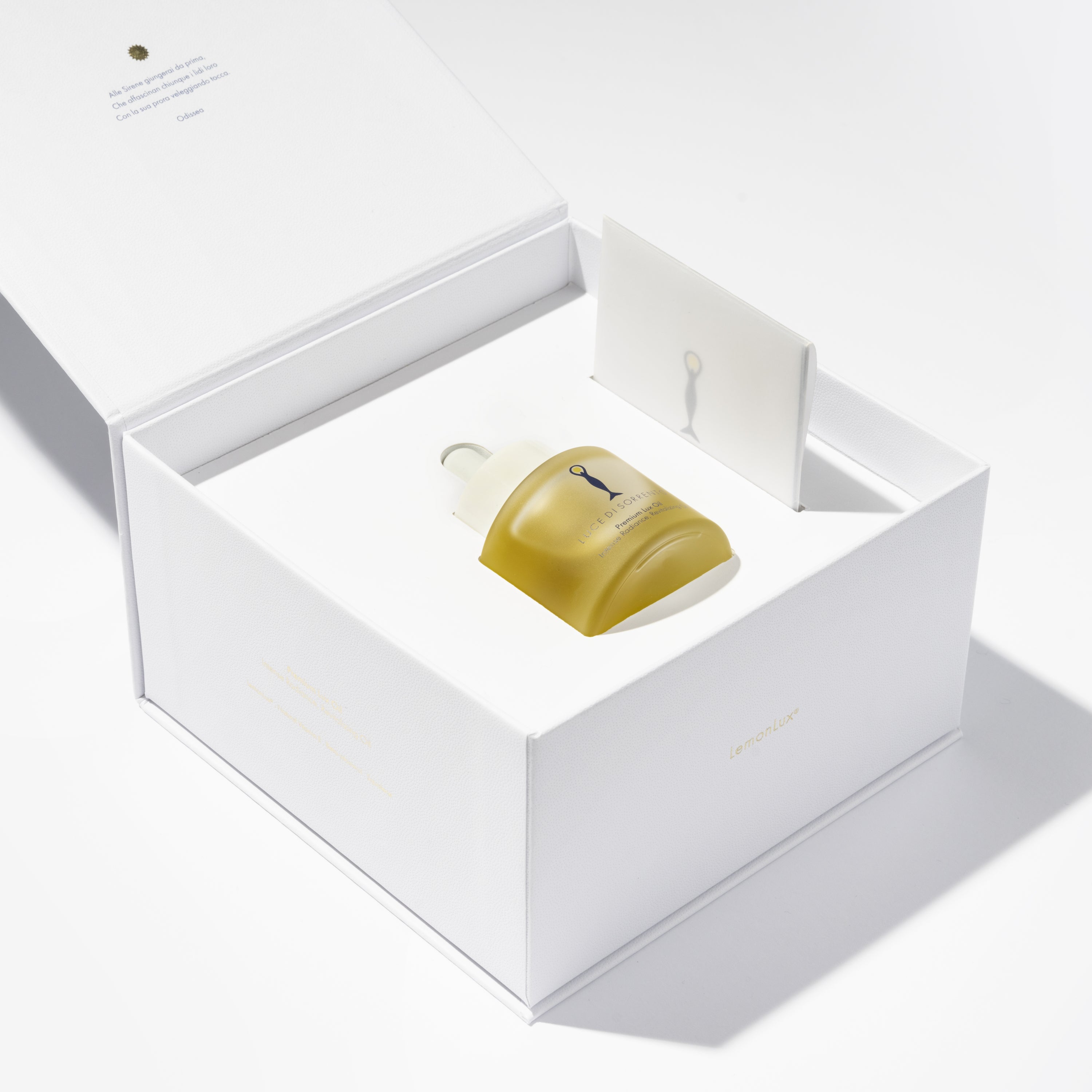 A concentrated formula, rich in precious natural protective oils, which combines the LemonLux® complex, made of the Sorrento Lemon Essential Oil and the organic Extra Virgin Olive Oil from the Sorrento Peninsula, with Vitamin E and vegetable Squalene, for an intensive and unique treat to revitalize, regenerate and brighten the skin.