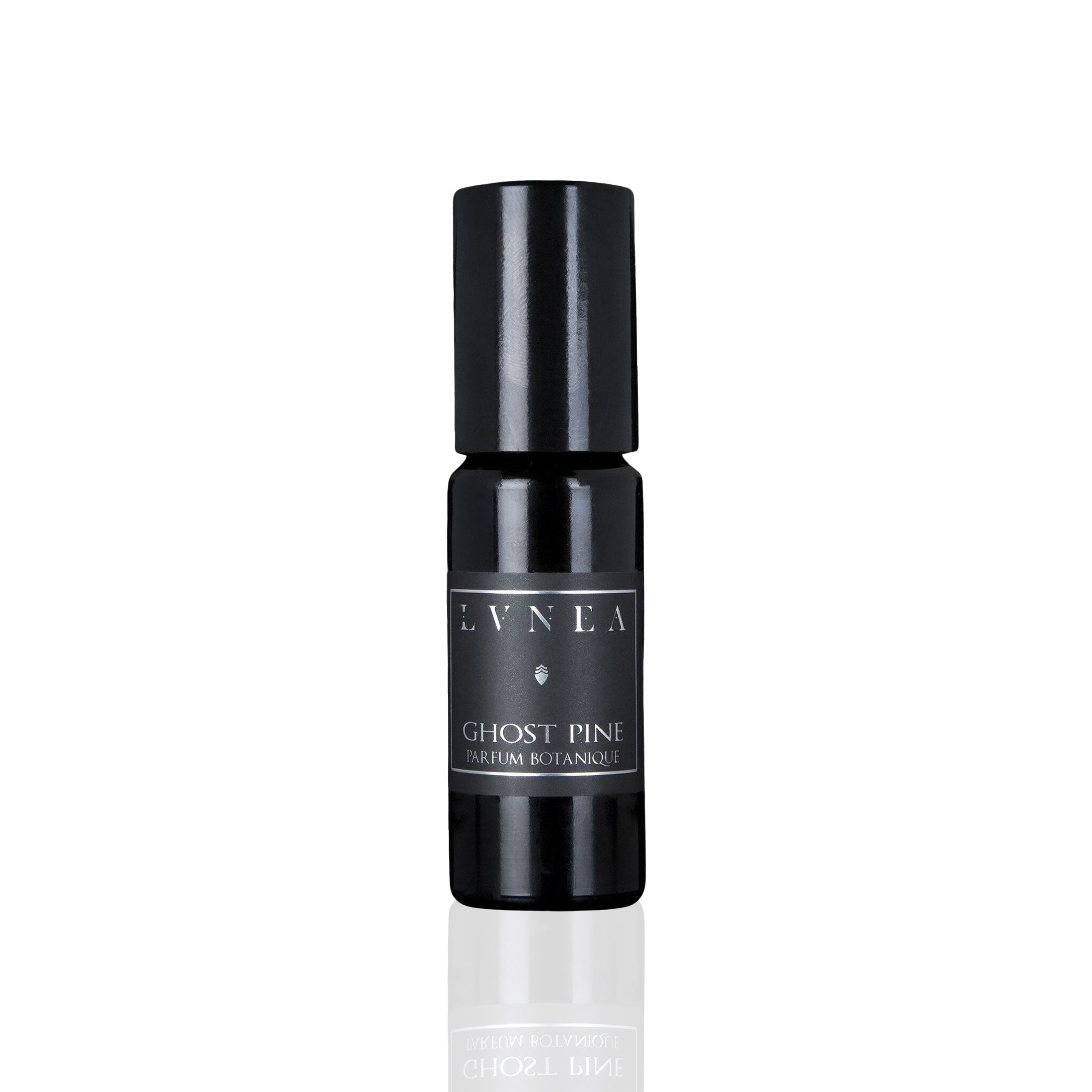 • LVNEA Ghost Pine Parfum Botanique – a 10ml black amethyst glass bottle with a glass roller ball, showcasing a fragrance of pine needles, wet leaves, and moss, encased in a matte black tube. The scent features coniferous, balsamic, and woody notes.
