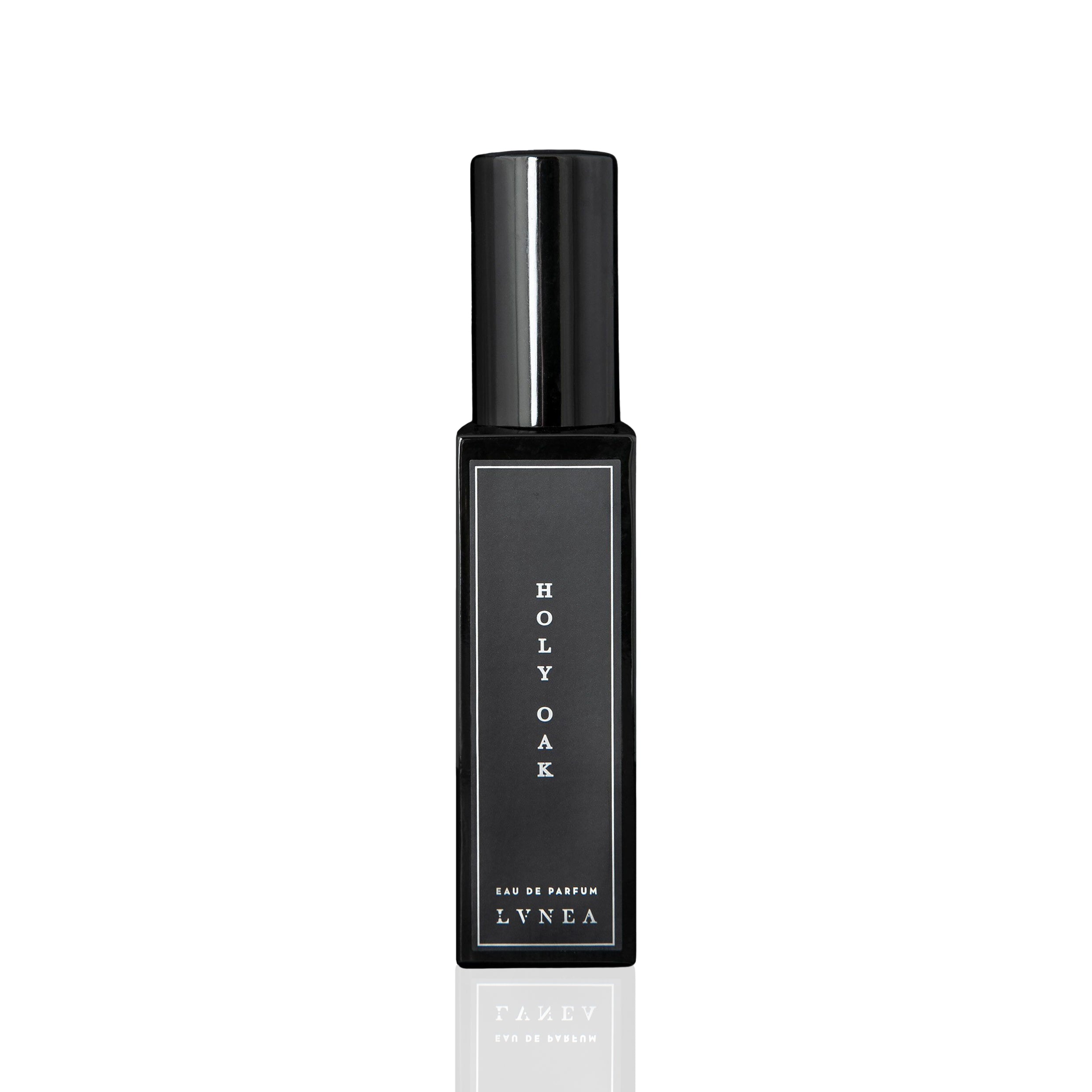 • LVNEA Holy Oak Eau De Parfum bottle, showcasing a deep, atmospheric fragrance blend of cedar leaf, oakmoss, oakwood, and rain. The 30 ml black glass bottle and 8 ml clear glass bottle with spray top are elegantly presented, reflecting the scent's essence of a rustic, rain-soaked cabin in a forest. 30ml