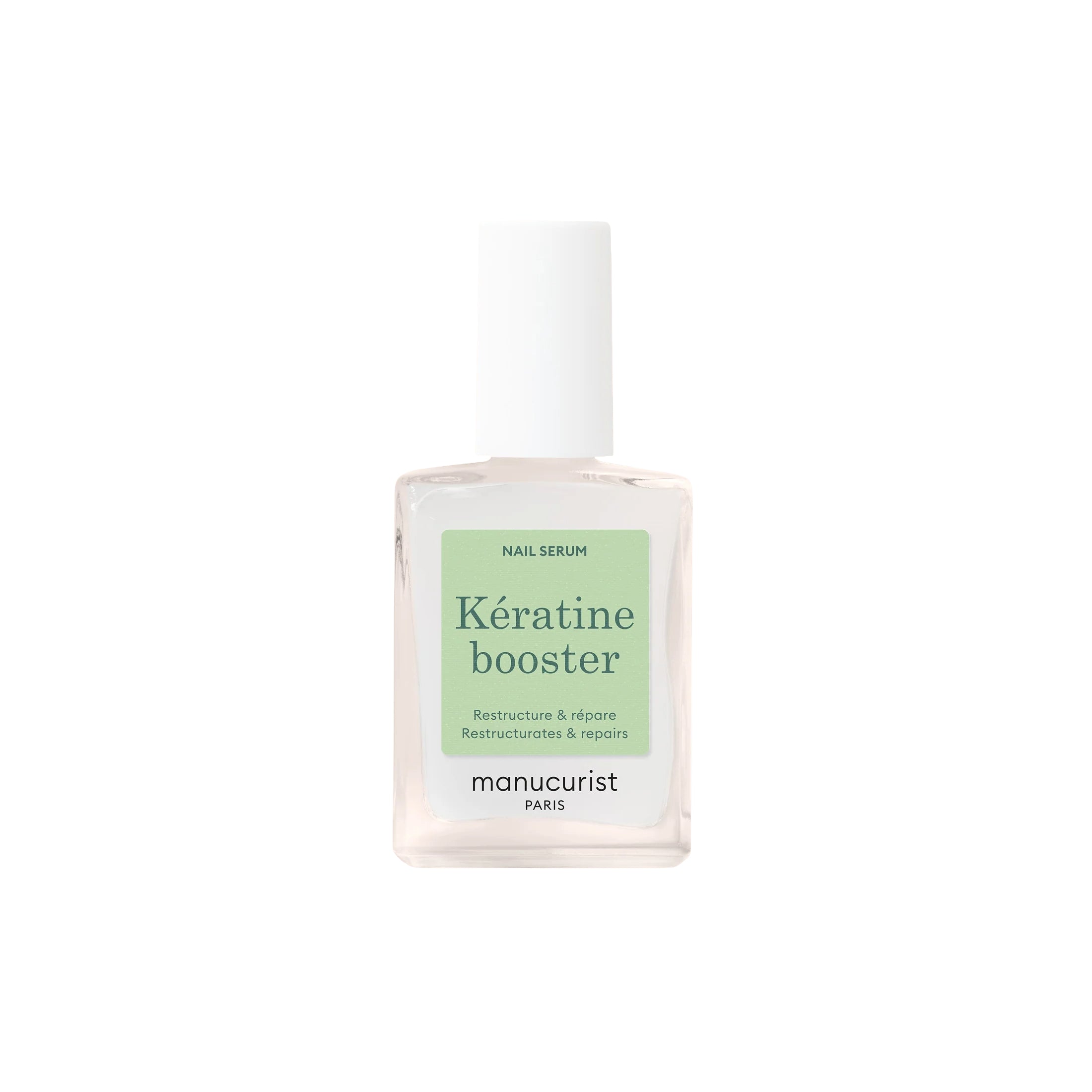• Close-up of MANUCURIST Kératine Booster Nail Strengthening Serum bottle, a keratin-rich polish designed to harden, repair, and fortify soft nails.