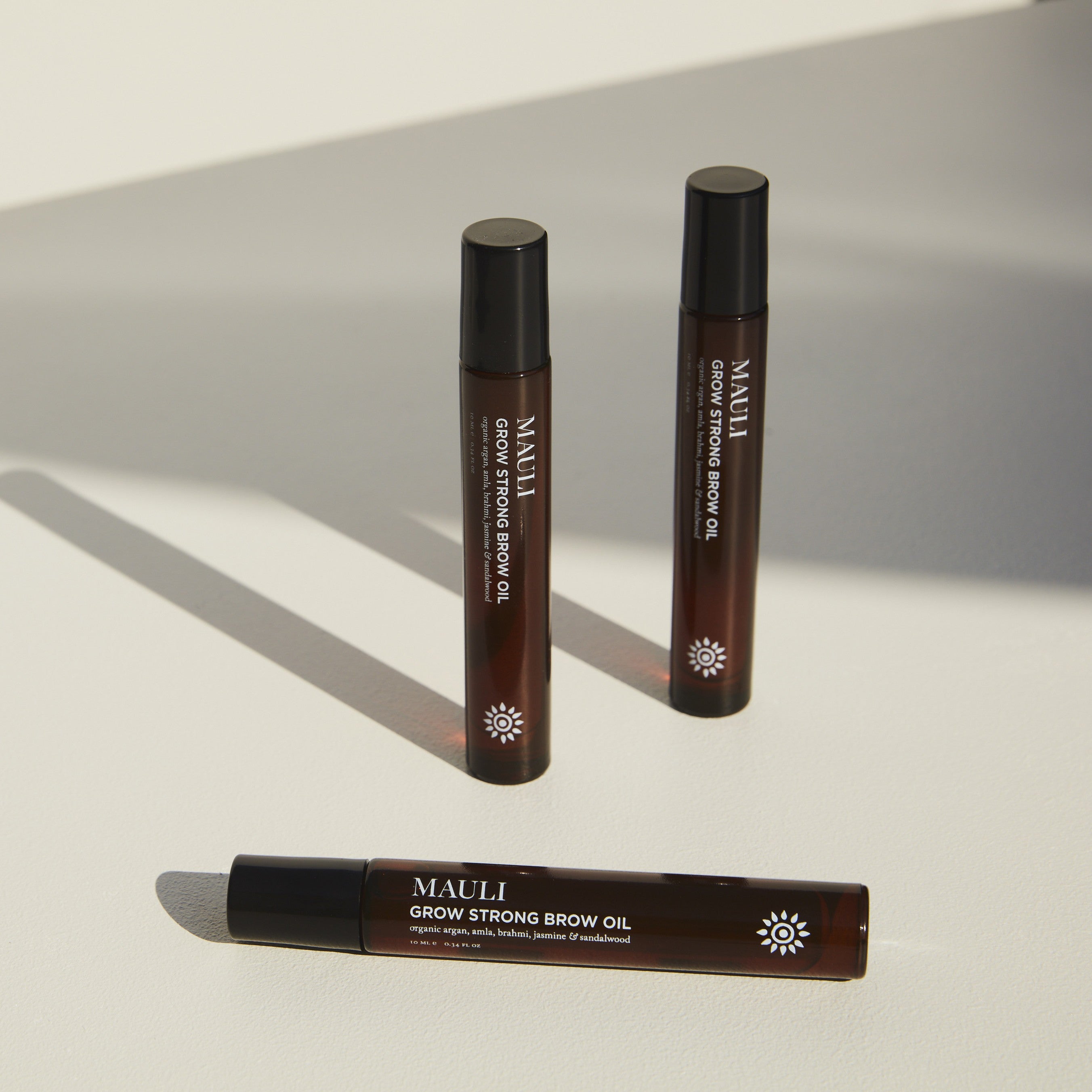 • Three bottles of MAULI Grow Strong Brow Oil on a light background