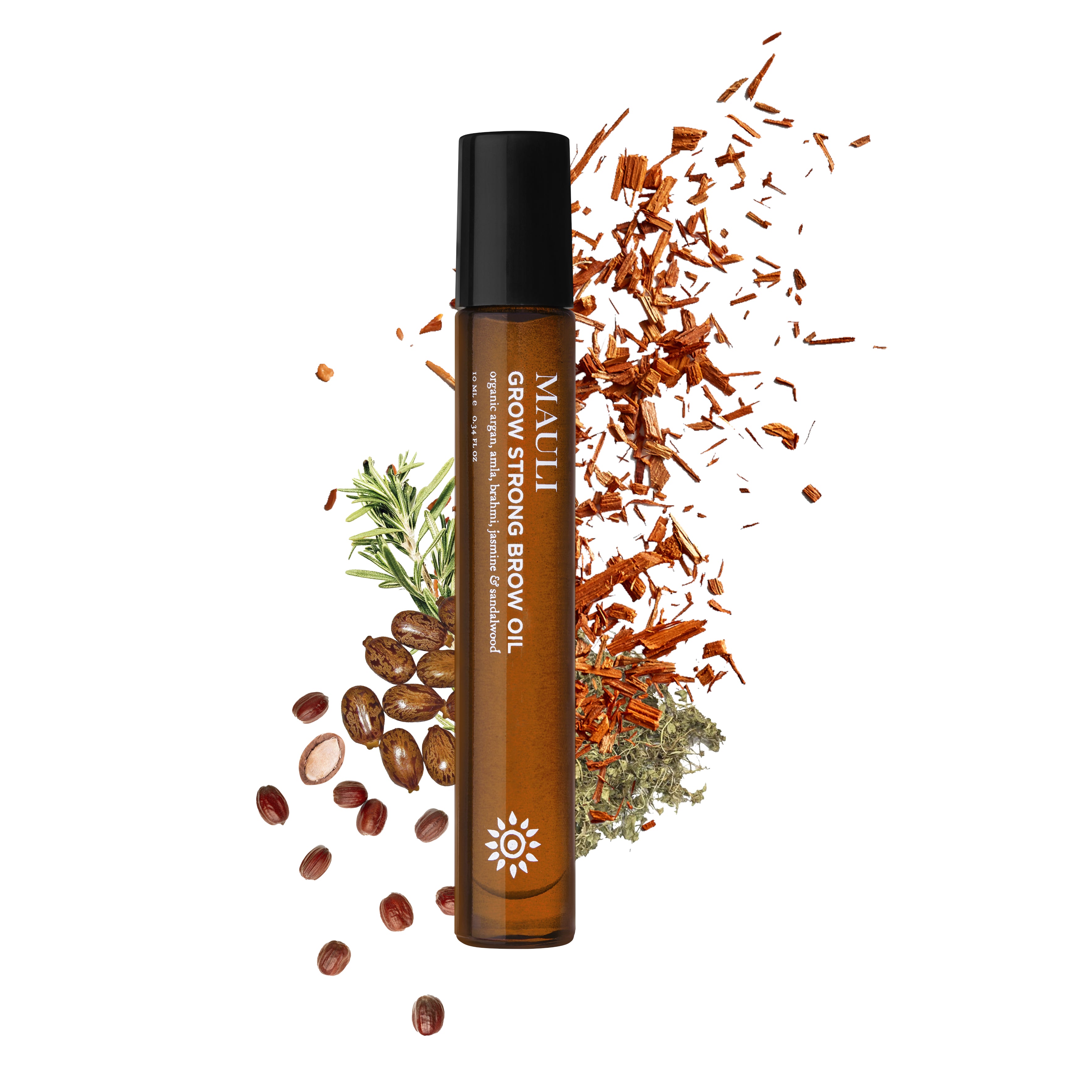 • MAULI RITUALS Grow Strong Brow Oil with ingredients around the glass bottle on white background