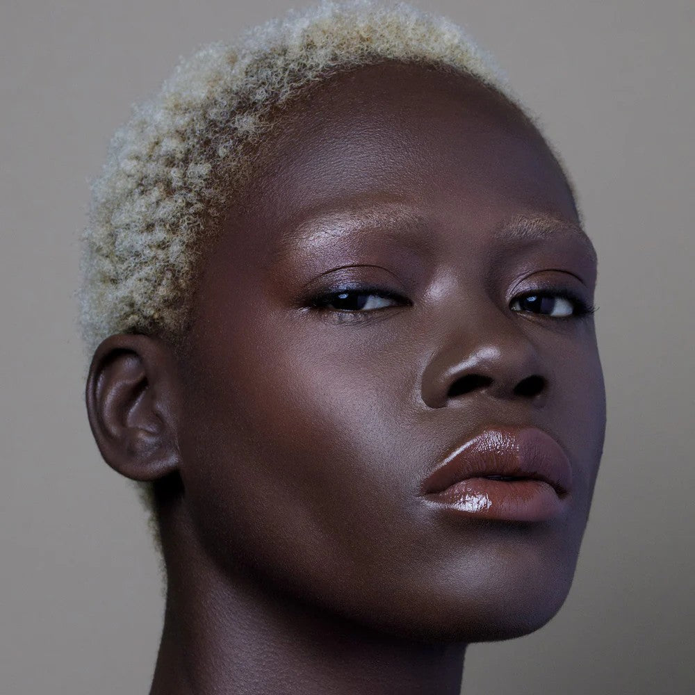 • Close-up of a person's face with a focus on the skin texture. RITUEL DE FILLE Color Nectar Pigment Balm Ghost Flower
