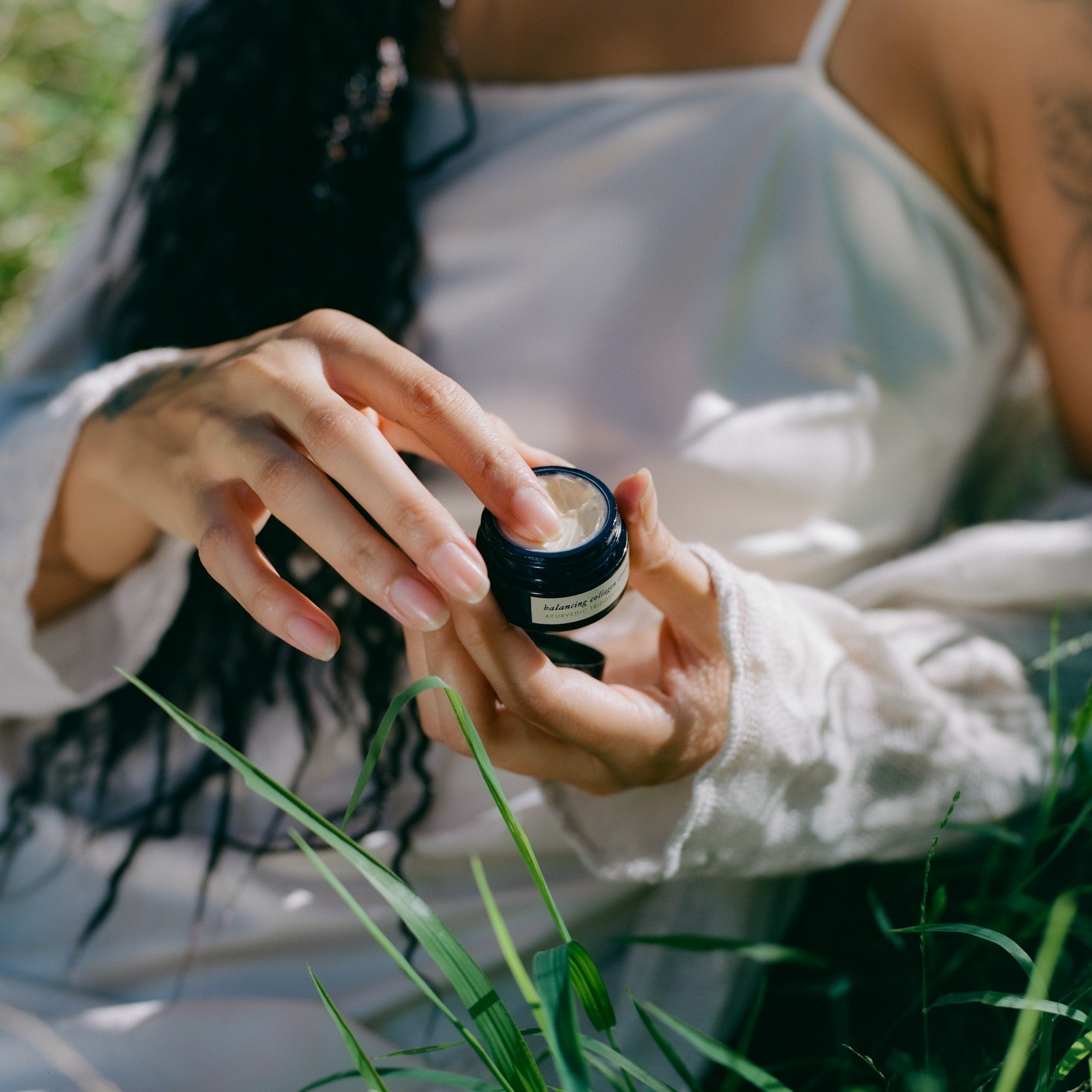 • Surya Balancing Collagen Cream in a glass jar: Rich, 100% natural cream with botanicals and camel’s milk collagen for deep hydration and nourishment.