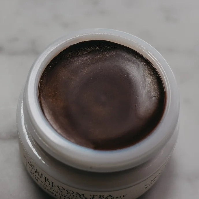 • TIDELANDS HOUSE Heirloom Tea Tinted Lip & Cheek Crème in a sleek container, showcasing the burnished darjeeling tea brown hue with antique rose pearl finish, enriched with Oakmoss Ferment and Wild Hyssop Flower.