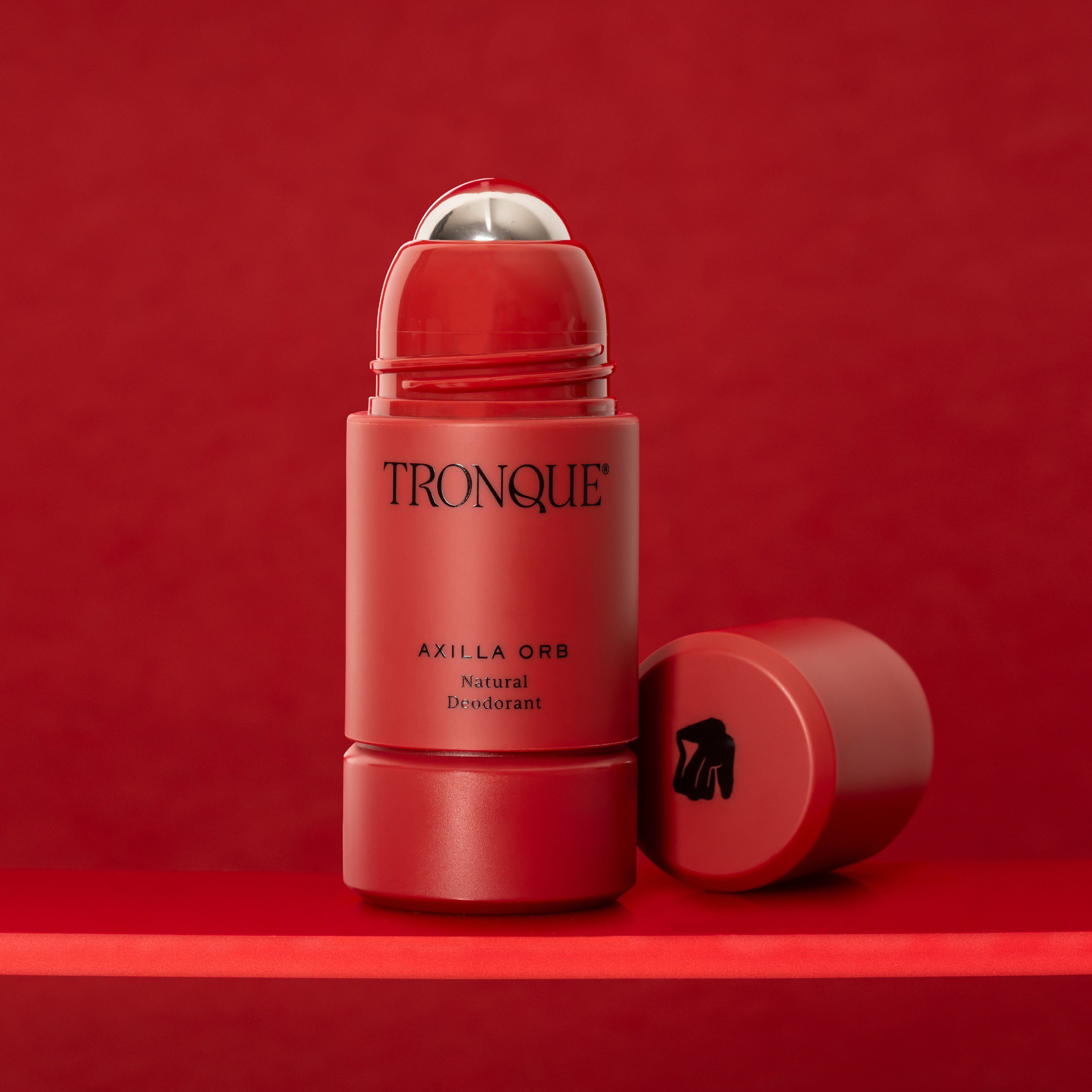 • Red deodorant stick with 'Tronque' branding on a white background. TRONQUE Natural Deodorant