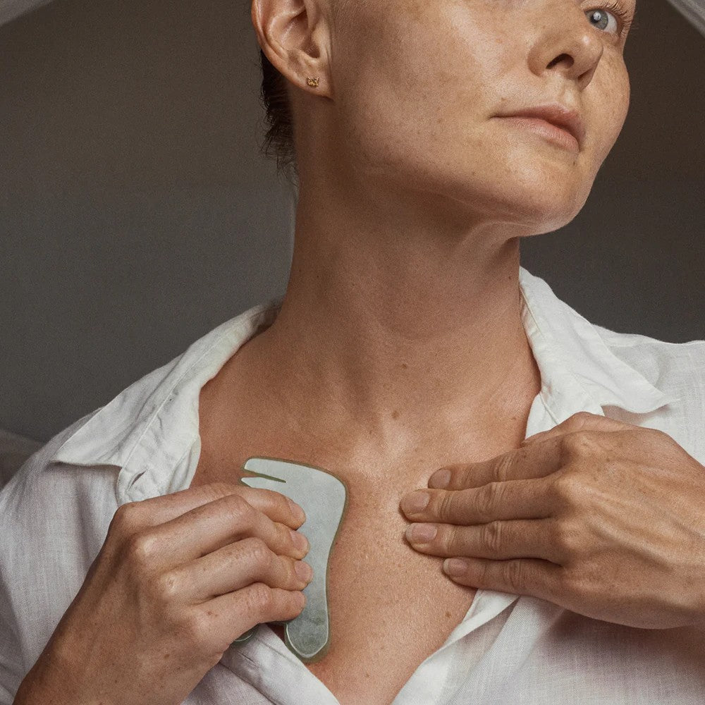 LOVI comb is a gua sha classic. Suitable for the whole body from head to toe, it makes for a great general wellness tool. The U-shaped end with a notch follows the natural contours of your jawline, cheekbones and front and back of the neck, while the long side works well for the décolletage, face and your entire body. Combing the skin and especially the scalp feels divine.